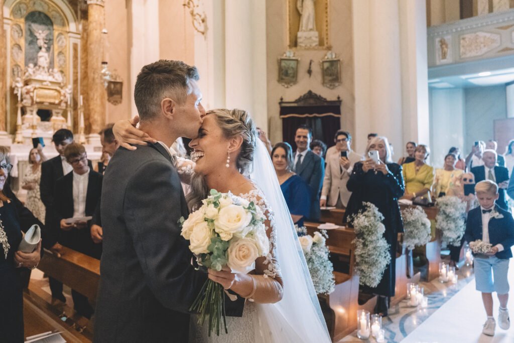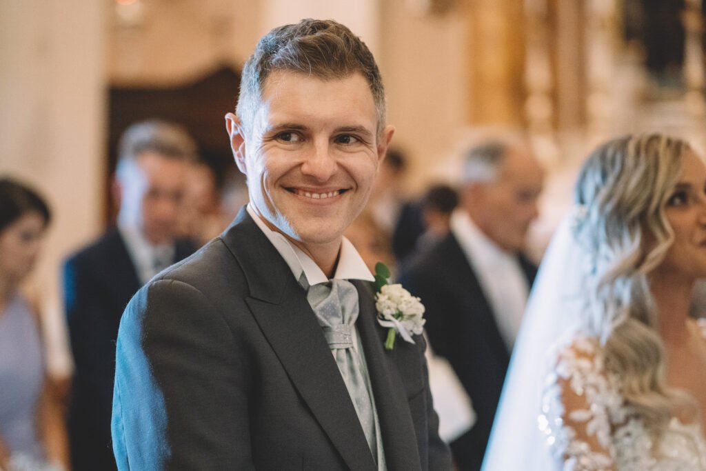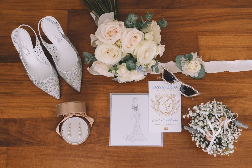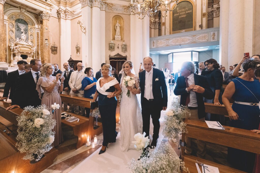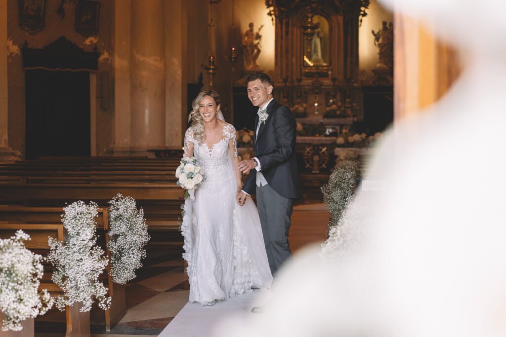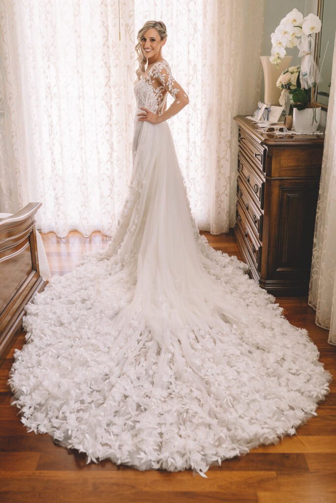 Giulia era un vero spettacolo in un magnifico abito di Mariages, che aggiungeva un tocco di eleganza classica alla giornata. Ogni dettaglio dell’abito era pensato per risaltare la bellezza naturale della sposa, rendendola protagonista assoluta del giorno.