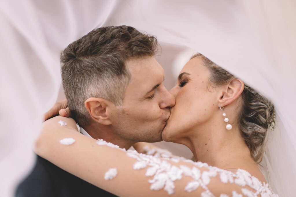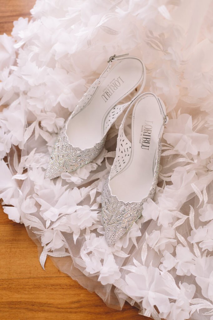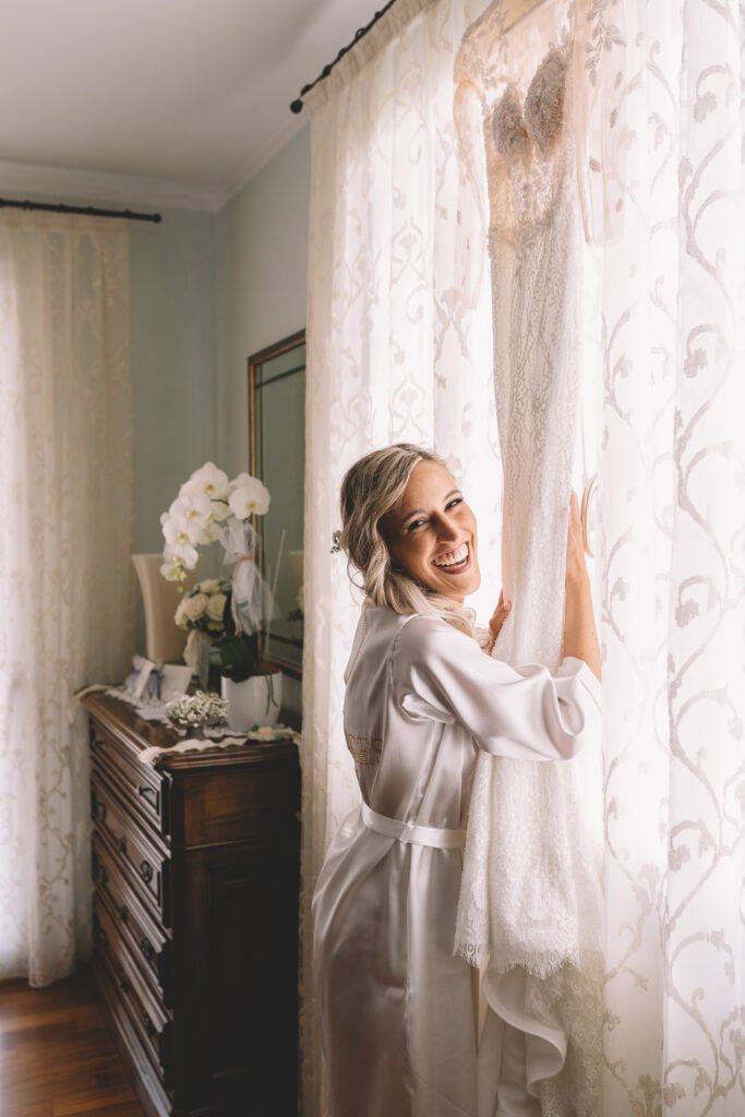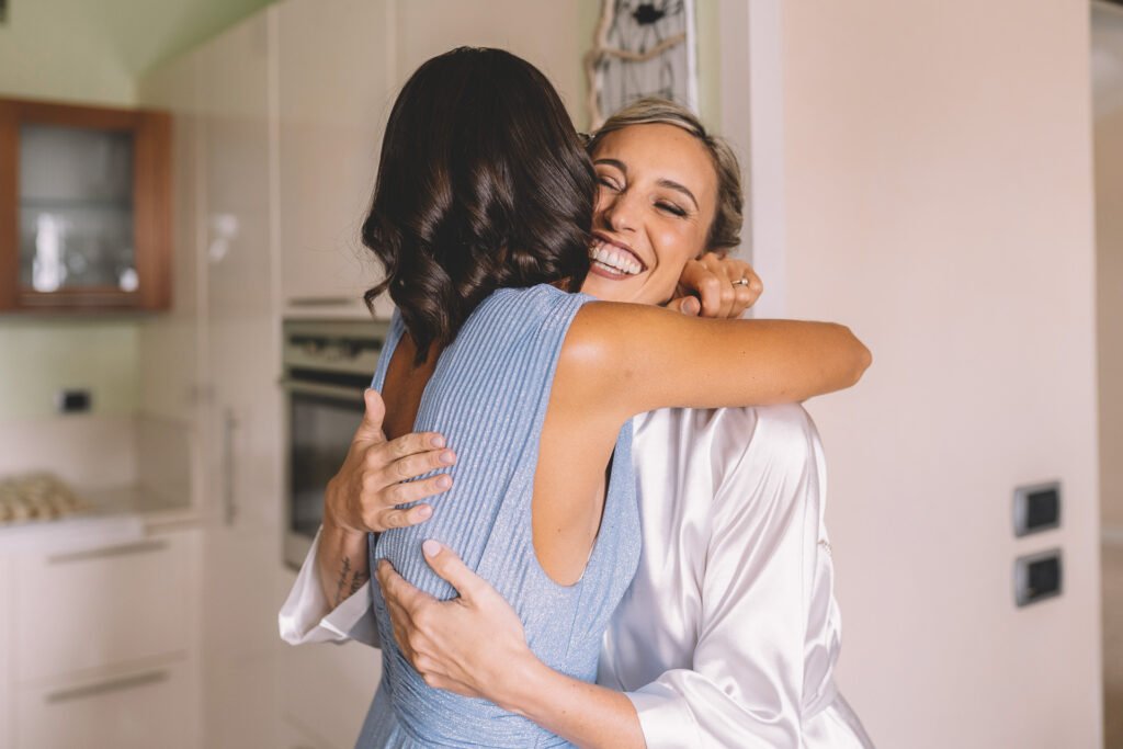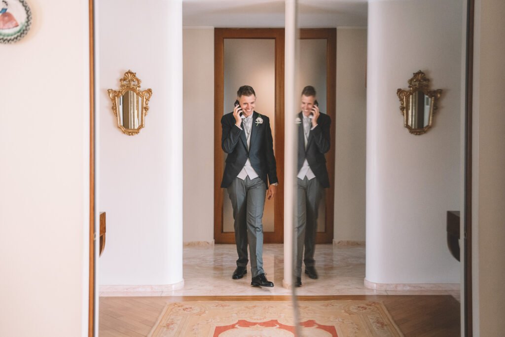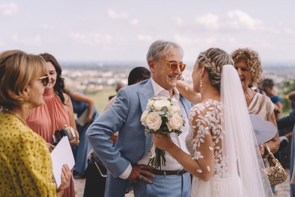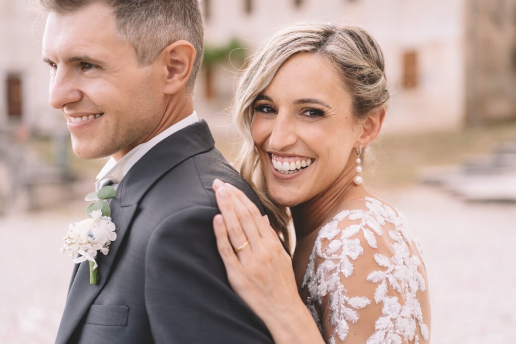 Giulia era un vero spettacolo in un magnifico abito di Mariages, che aggiungeva un tocco di eleganza classica alla giornata. Ogni dettaglio dell’abito era pensato per risaltare la bellezza naturale della sposa, rendendola protagonista assoluta del giorno.